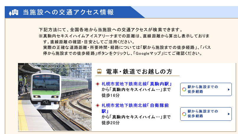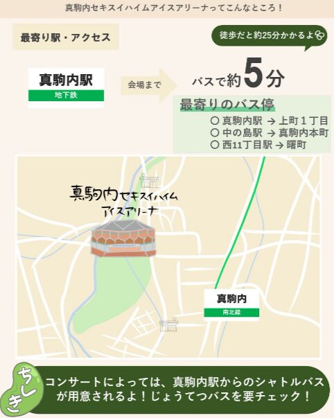 | 真駒内セキスイハイムアイスアリーナ | 地下鉄南北線 真駒内駅 徒歩約25分 駅北出口から複数の路線バス バスは「上町1丁目」停留所 | 札幌駅から地下鉄南北線で乗換なしでアクセス可能 |