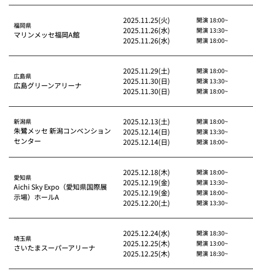 | 2025年12月25日(木) | さいたまスーパーアリーナ | 埼玉 | 平日 | 13:30/18:30(複数公演) |