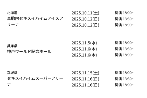 | 2025年10月12日(日) | 真駒内セキスイハイムアイスアリーナ | 北海道 | 週末 | 13:30/18:00(複数公演) |