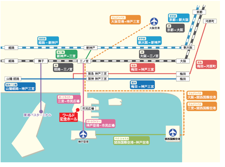 | ワールド記念ホール | 神戸新交通ポートアイランド線の「市民広場駅」で、駅から徒歩約4分 | 新大阪駅から神戸駅まで新幹線・JR快速利用可。駅近で徒歩圏内 |