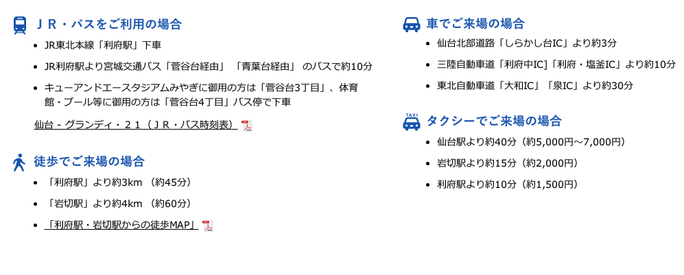 | セキスイハイムスーパーアリーナ | JR東北本線利府支線の利府駅 徒歩だと約1時間 通常は路線バスかタクシーの利用が推奨 | 東北新幹線で仙台駅下車、バス利用推奨 |