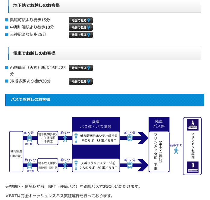 | マリンメッセ福岡 A館 | 福岡市地下鉄箱崎線の呉服町駅 呉服町駅の3番出口から徒歩約15分程 | 福岡空港から地下鉄30分、博多駅は交通の要所 |
