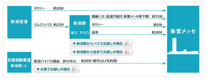 | バス | 約15分 | 新潟駅万代口17番線乗車、「朱鷺メッセ」下車 |