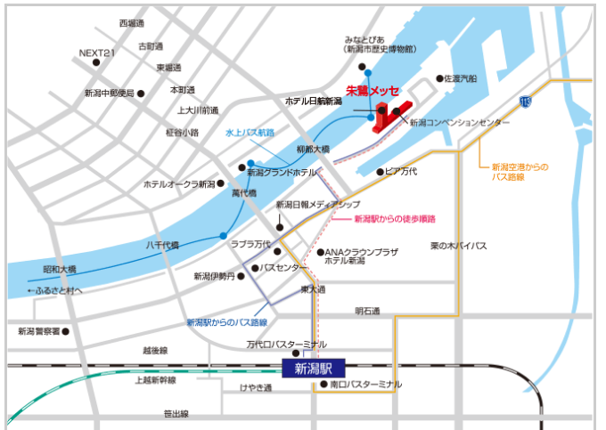 | 朱鷺メッセ | JR新潟駅からバス約15分 | 新潟空港からバス連絡、公共交通利用が便利 |