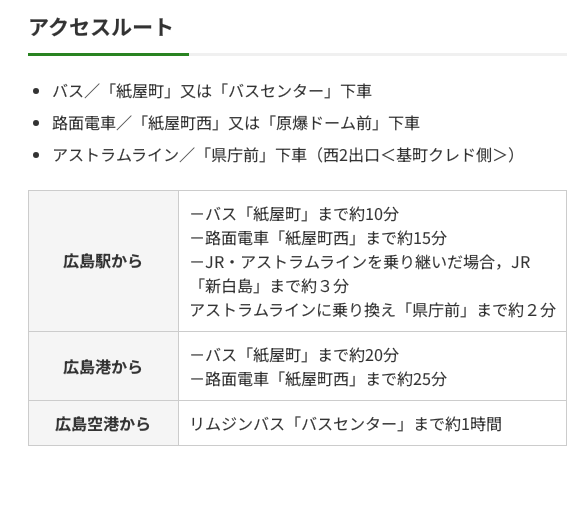 「原爆ドーム前駅」か「県庁前駅」からの徒歩5分圏内が最も便利なアクセス路線とされています。