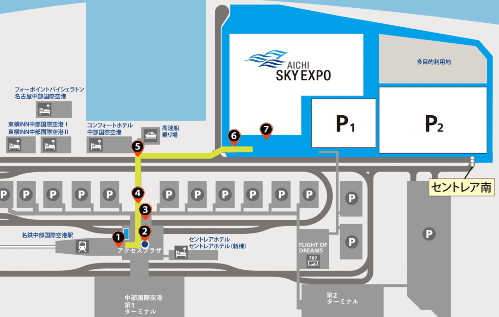 Aichi Sky Expoの最寄り駅は、名鉄空港線の「中部国際空港駅」で、駅から徒歩約5分でアクセス可能です。