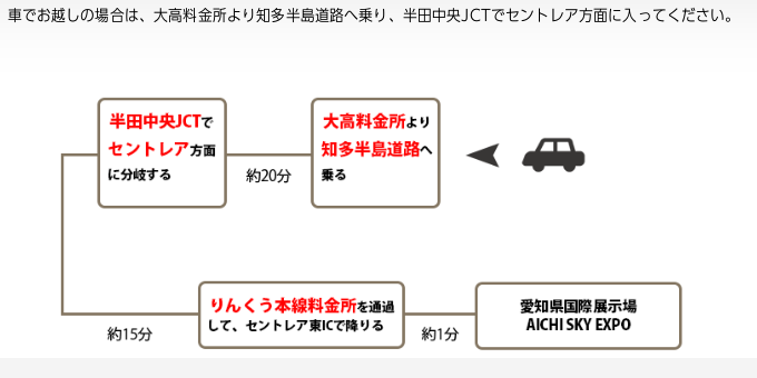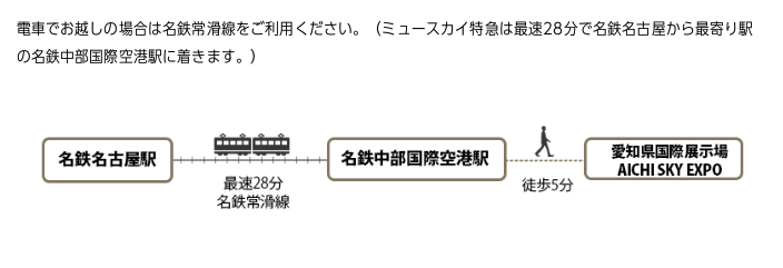 | Aichi Sky Expo | 名鉄空港線の「中部国際空港駅」で、駅から徒歩約5分 | 新幹線名古屋駅からバス/タクシー利用が主 |
