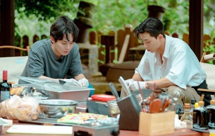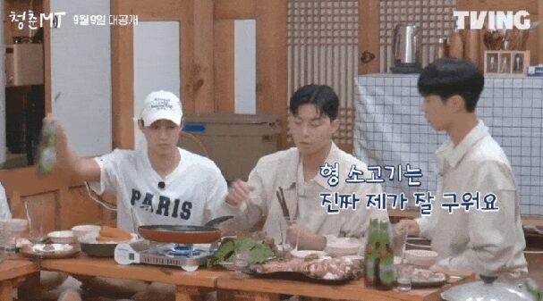 後輩のパク・ボゴムさんたちに肉を焼いてあげるパク・ソジュンさん。